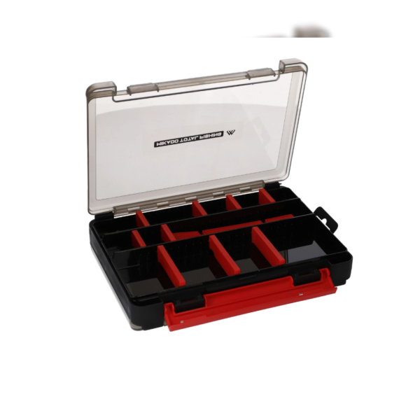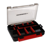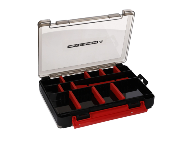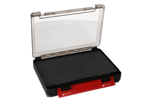 Dwustronne pudełko wędkarskie wykonane z wysokiej jakości plastiku z pewnym zamykaniem.