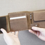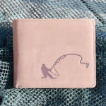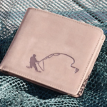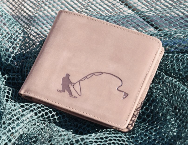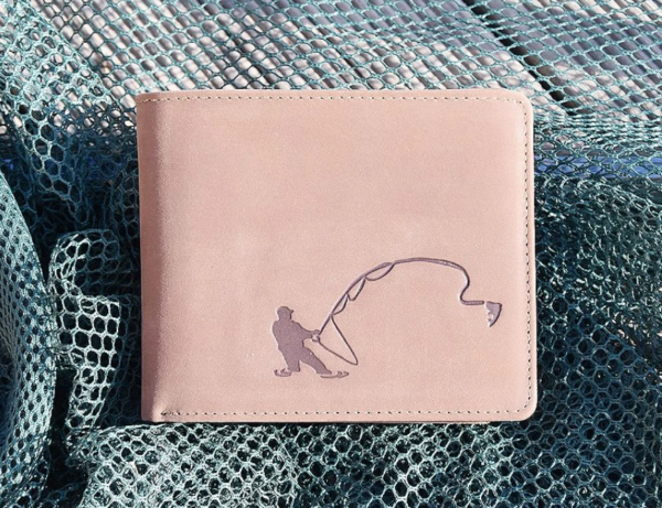 Galanteria skórzana dla wędkarzy. Portfel z tłoczonym wędkarzem.